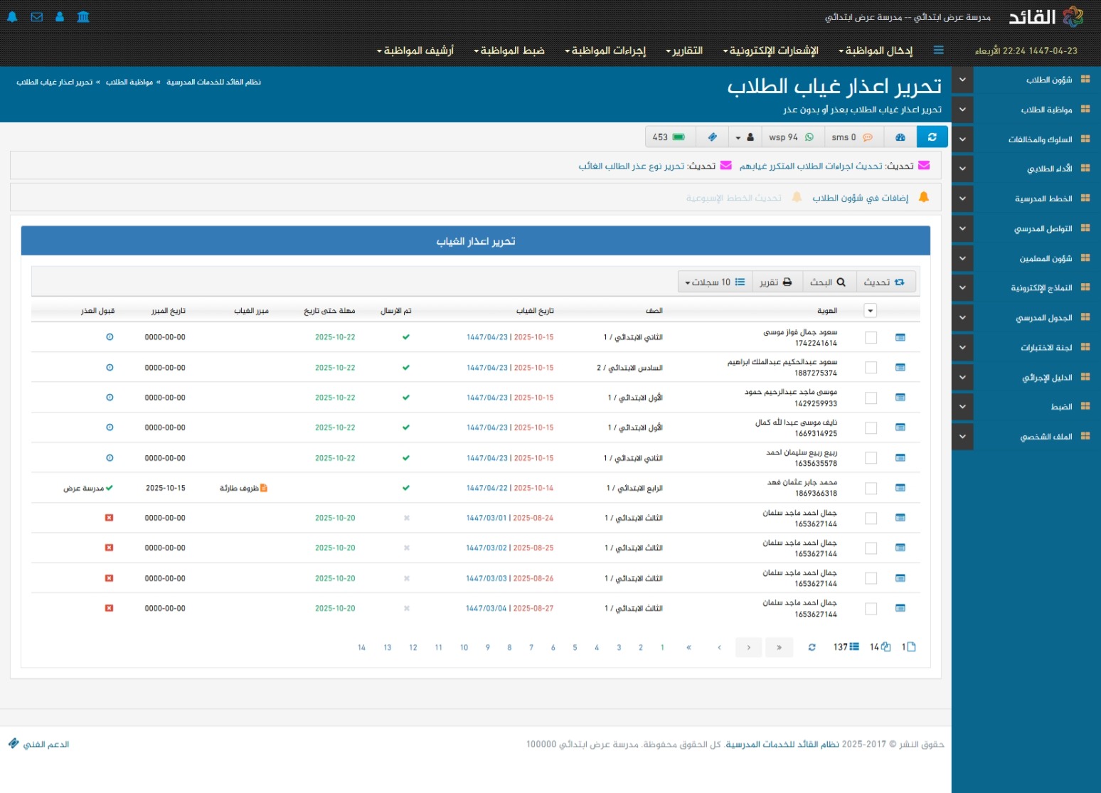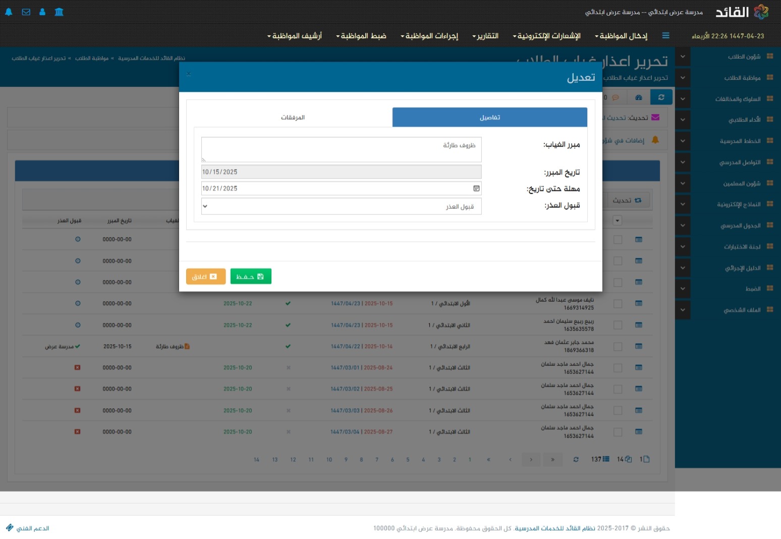 لسهولة الاجراءات يمكن الان متابعة اعذار الطالب المضافة بواسطة ولي الأمر الكترونيا والتحرير عليها وتعديل العذر الى بعذر او بدون عذر او اعادة الأمر الى لوحة تحكم ولي الأمر ليتسنى له رفع العذر مرة اخرى واضافة المرفقات الداعمة لنوع عذر الطالب . كما يمكن للمستخدم في المدرسة من اضافة مرفقات عوضا عن ولي الأمر إذا احتاج ذلك واضافة التعليقات عن اسباب العذر . ملاحظة عند تحرير نوع العذر الى انتظار فإن ولي الأمر يستطيع كتابة المبررات مرة اخرى شرط أن يكون تاريخ المهلة مناسبة وليست في وقت مضى . اما بعد قبول العذر أو رفضه فلا يستطيع اعادة كتابة المبررات . بالنسبة للمستخدمين الاضافيين في المدرسة اذا كنت قد فعلت صلاحية المستخدم على صلاحية الفصول فلن تظهر اعذار الطلاب الى للصفوف التي منحتها للمستخدم فقط . يمكنك الوصول الى تحرير اعذار الطلاب الغائبين من القائمة / مواظبة الطالب / الإشعارات الإلكترونية / تحرير اعذار غياب الطلاب