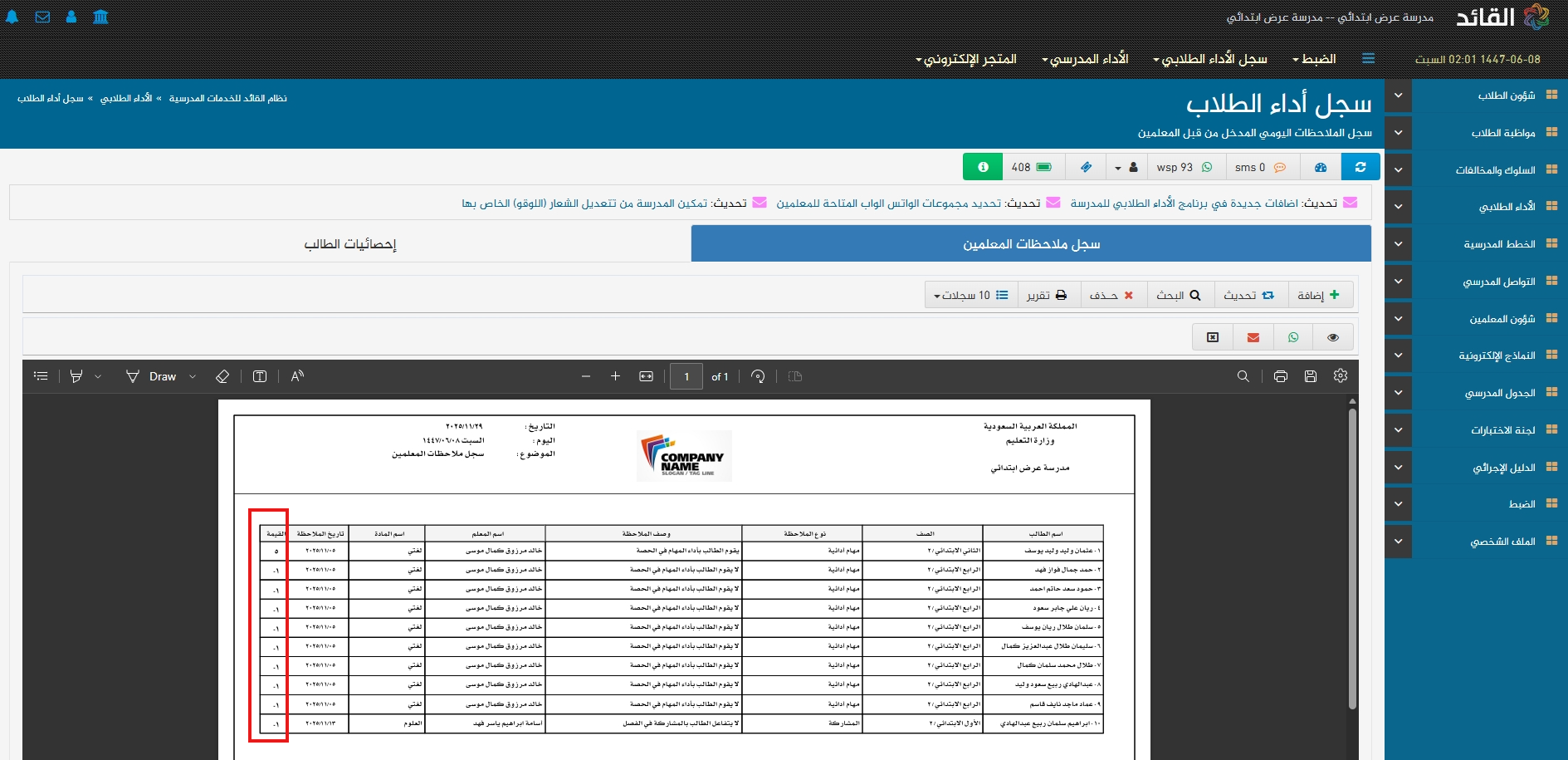 تم تطبيق ارسال ملاحظات أداء الطلاب .
