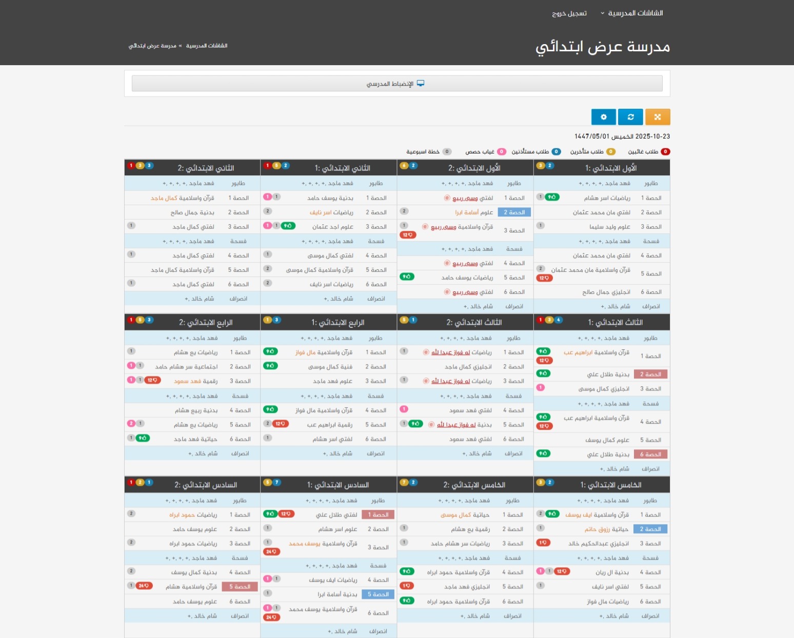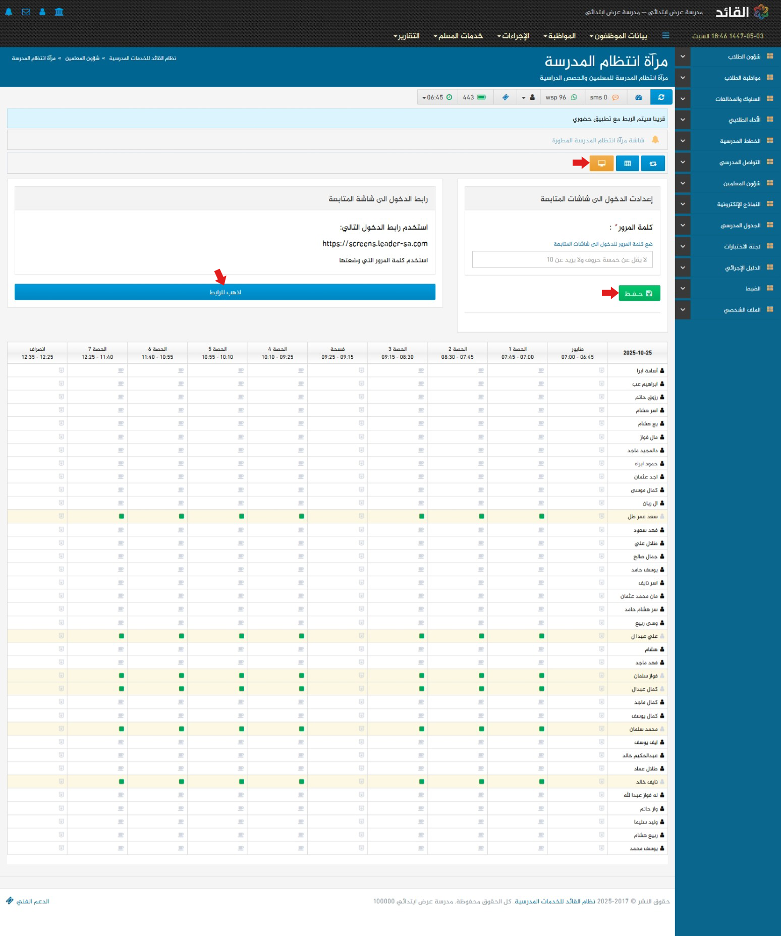 اضافات جديدة على شاشة مرآة انتظام المدرسة المطورة شملت مزيد من العناصر . خيارات ممكن التحكم بها واضافة طريقة العرض بالاضافة الى خدمات اخرى مثل الغياب الطلاب وتاخرهم وغياب الحصص والخطط الاسبوعية والأداء الطلابي