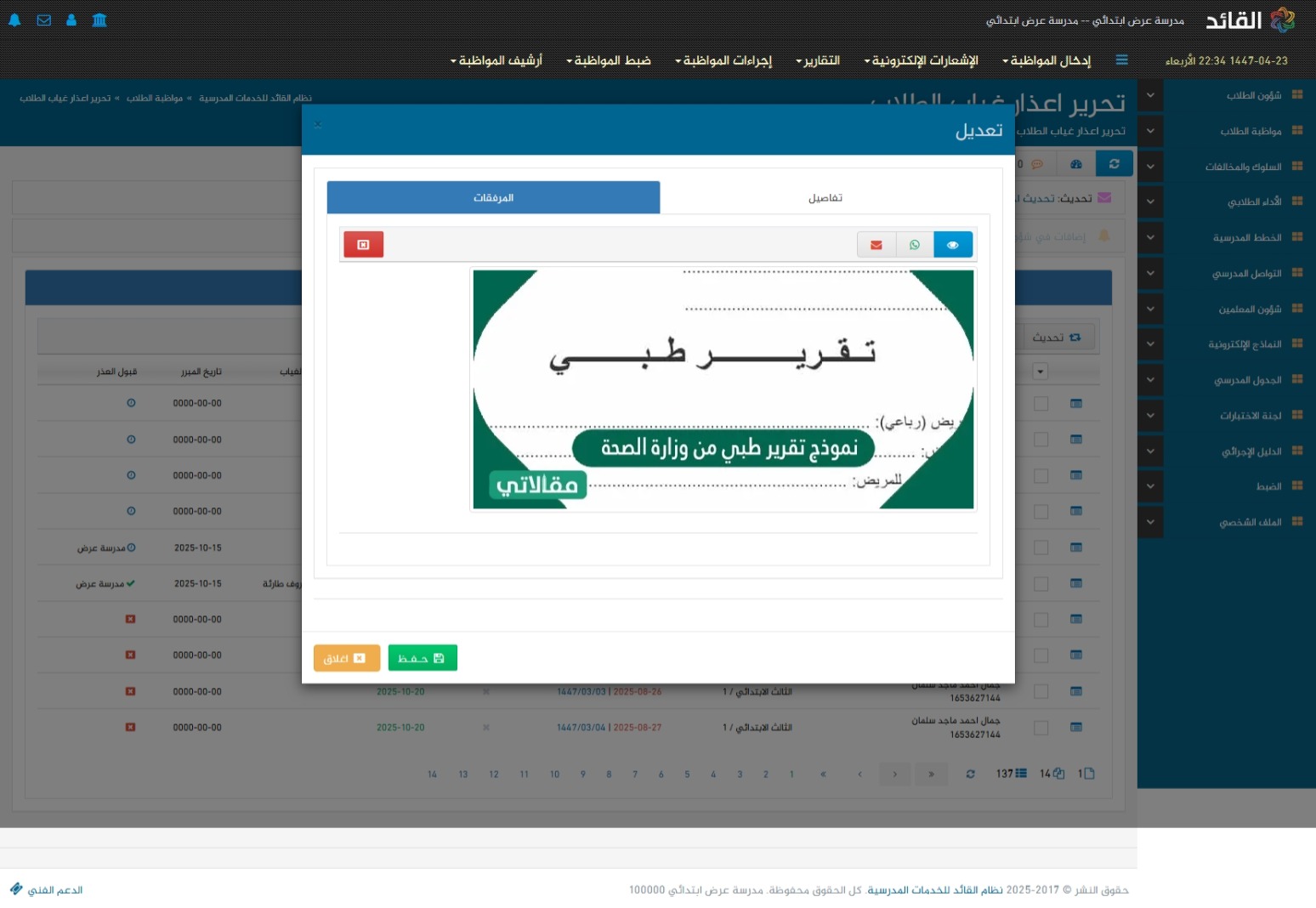 لسهولة الاجراءات يمكن الان متابعة اعذار الطالب المضافة بواسطة ولي الأمر الكترونيا والتحرير عليها وتعديل العذر الى بعذر او بدون عذر او اعادة الأمر الى لوحة تحكم ولي الأمر ليتسنى له رفع العذر مرة اخرى واضافة المرفقات الداعمة لنوع عذر الطالب . كما يمكن للمستخدم في المدرسة من اضافة مرفقات عوضا عن ولي الأمر إذا احتاج ذلك واضافة التعليقات عن اسباب العذر . ملاحظة عند تحرير نوع العذر الى انتظار فإن ولي الأمر يستطيع كتابة المبررات مرة اخرى شرط أن يكون تاريخ المهلة مناسبة وليست في وقت مضى . اما بعد قبول العذر أو رفضه فلا يستطيع اعادة كتابة المبررات . بالنسبة للمستخدمين الاضافيين في المدرسة اذا كنت قد فعلت صلاحية المستخدم على صلاحية الفصول فلن تظهر اعذار الطلاب الى للصفوف التي منحتها للمستخدم فقط . يمكنك الوصول الى تحرير اعذار الطلاب الغائبين من القائمة / مواظبة الطالب / الإشعارات الإلكترونية / تحرير اعذار غياب الطلاب