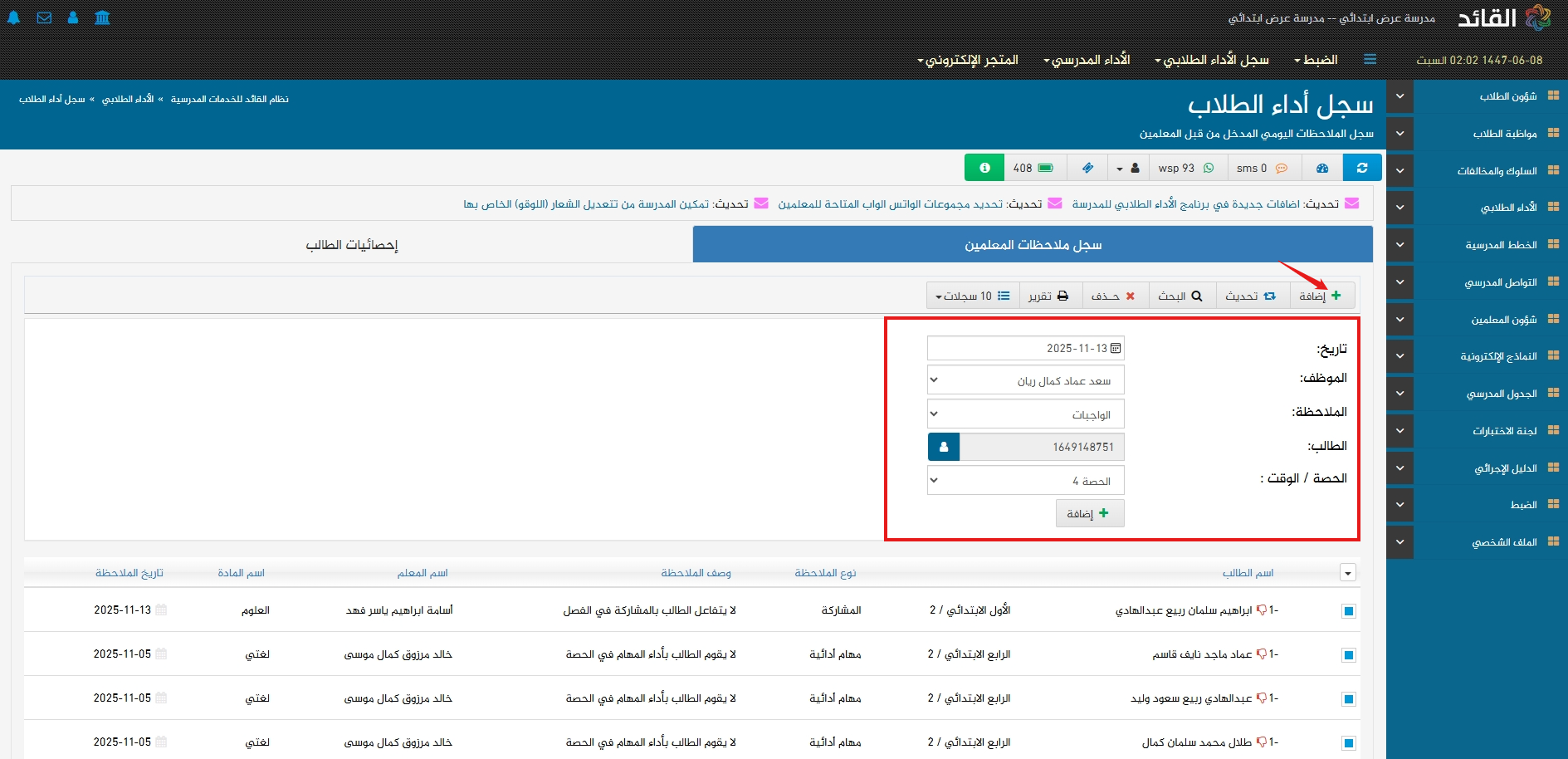 تمكين إدارة المدرسة من رصد ملاحظات أداء الطلاب الايجابية والسلبية